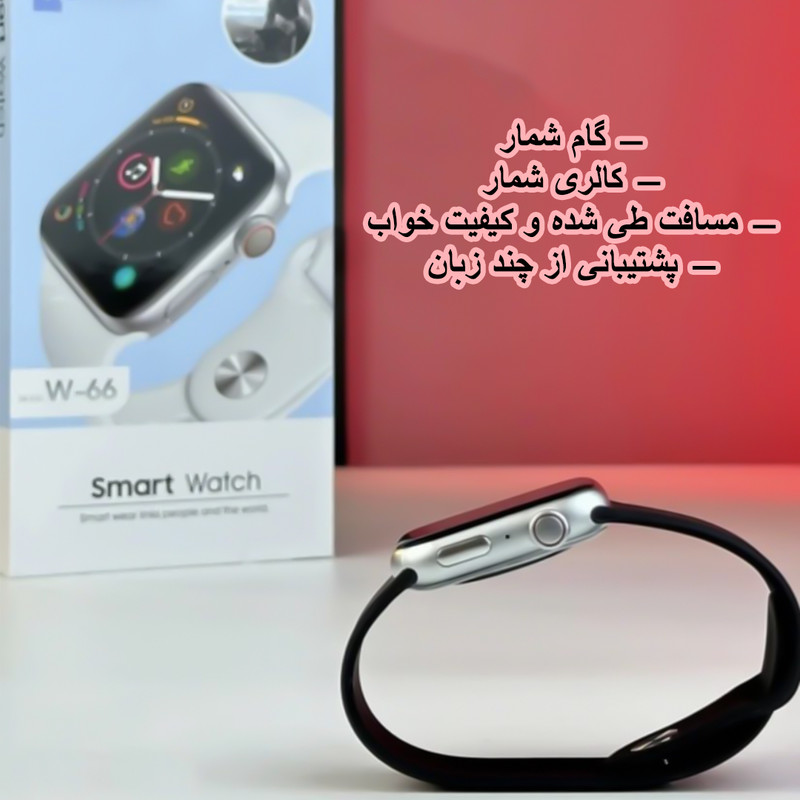 ساعت هوشمند W-66 یک نسخه جدید دیگری از سری W ساعت های هوشمند است که توجه بسیاری از مردم جهان را به خود جلب کرده است. این ساعت دارای قابلیت های بسیاری میباشد از جمله: قابلیت اتصال به اندروید و ios - ضد آب دارای تاییدیه IP۶۸ - پشتیبانی از زبان فارسی - دارای ۳۴ تم مختلف - سری ۵ سایز ۴۴m - امکان برقراری تماس از طریق ساعت - مشاهده کلیه پیام های دریافتی و اعلان های شبکه های اجتماعی، اینستاگرام، تلگرام و... - مجهز به سنسور نوار قلب دقیق - قابلیت ECG (محاسبه الکترو کاردیوگرام) - سنسور اکسیژن خون و کالری سنج دقیق - دارای سنسور فشار خون و گام شمار ۳D - میزان مسافت طی شده و کیفیت خواب - سنسور چرخش مچ(ژیروسکوپ) - قابلیت تعویض منو و فیس واچ های جذاب - جنس بدنه آلومینیوم ضد حساسیت - نوع صفحه نمایش OLED - کیفیت صفحه نمایش Full HD - صفحه نمایش تمام مشکی - صفحه نمایش ضد خش -دارای باتری تقویت شده(شارژ استندبای تا ۵ روز) - دارای اسپیکر و میکروفون -قابلیت ضصبط صدا - شاتر موزیک - شاتر دوربین -دارای وایرلس شارژ - قابلیت تنظیم آلارم - قابلیت تعویض بند - پشتیبانی بیش از ۱۰ زبان - هم چنین دارای شارژر مگنتی میباشد.